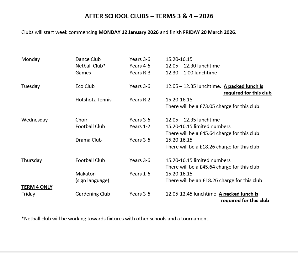 AFTER SCHOOL CLUBS – TERMS 3 & 4 – 2026